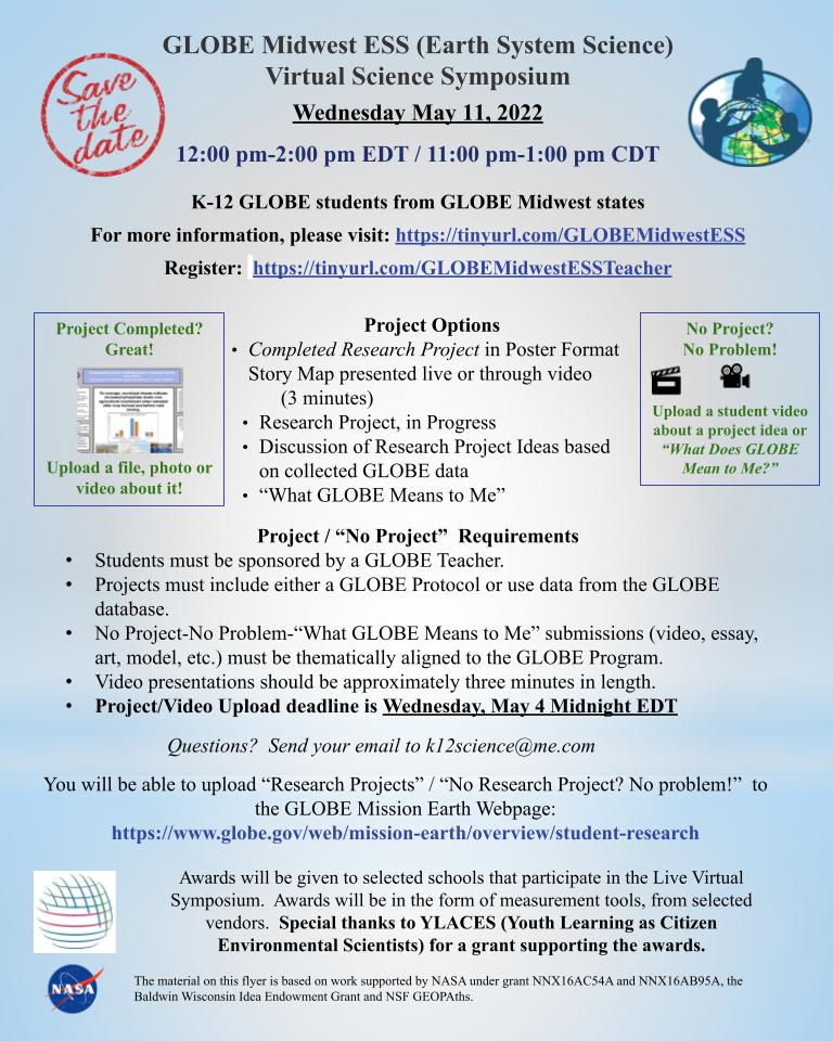 Thanks to everyone who participated in the 2022 GLOBE Midwest ESS Virtual Science Symposium. You can view the Symposium on YouTube at: https://youtu.be/g5MbMFscoxs