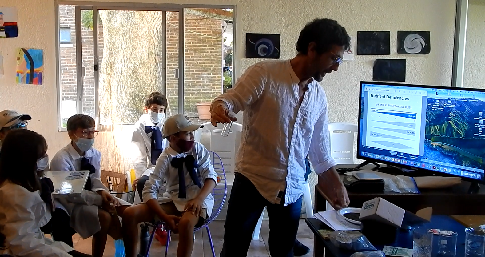 The field workshop was held on 5 April 2022 in School Nº88 Alfred Nobel, located in Canelones, Uruguay; this school was chosen since it is a rural location and has appropriate land for soil excavation and laboratory work. The school principal, Darío Greni, offered to host the event since they had previously participated in two similar workshops. The principal said, “It is an honor for us to welcome you in our school and to be the hosts of this workshop that allows us to apply protocols in a practical way while creating bonds with participants which can bring about future projects. This workshop allows us to update our capacities and to work fluidly in the protocols that will be applied in our institutional projects.” Last year, the US Embassy in Uruguay awarded a grant to pay for the housing, teaching hours and the trainer fees of Trainer Henry Ortiz from Los Angeles who has been working on soil since 2005; Ortiz was chosen to come to Uruguay to give the soil workshop for the first time for the Program in the country.