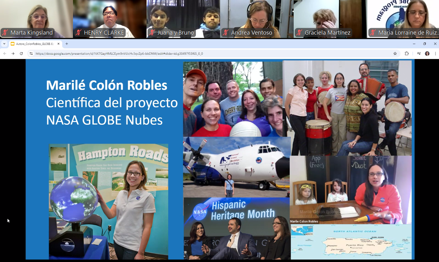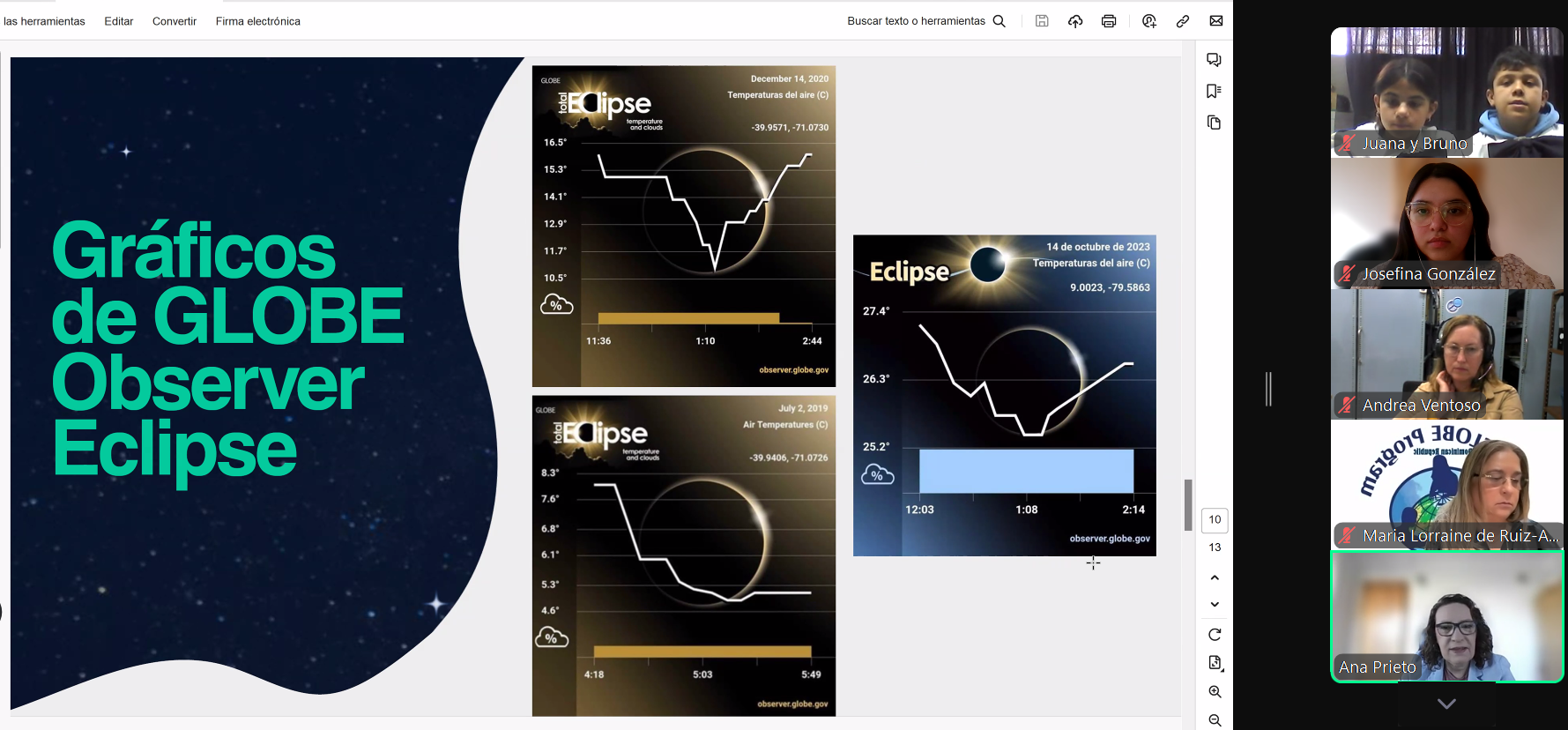 La oradora principal fue Marilé Colón Robles, Project Scientist de NASA GLOBE Clouds, quien presentó el tema "Descubriendo los nuevos hallazgos sobre el Eclipse Solar Total del 2024" . Posteriormente, Ana Prieto, Mentor Trainer del Technology Working Group del GLOBE Program, ofreció una presentación sobre el uso de la aplicación Globe Observer para tomar mediciones durante el eclipse. Para finalizar, los estudiantes Juana y Bruno, de la Escuela Rural 88, guiados por su maestro y director Darío Greni, Trainer del Education Working Group del GLOBE Program, compartieron sus experiencias.