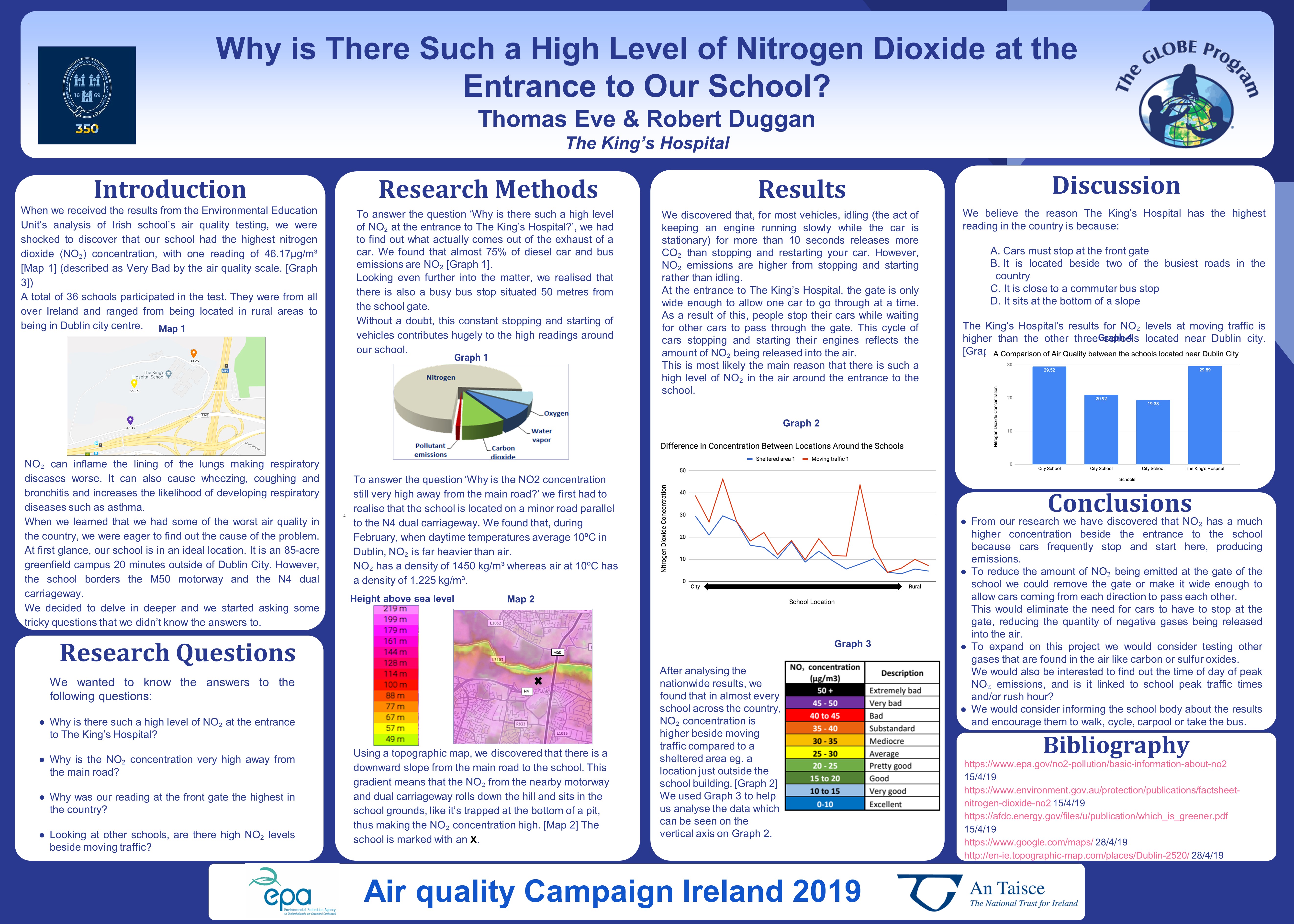 Abstract We had the air quality in different places in our school tested and found that at the front entrance it was the worst for any school in Ireland. We looked into why this was and what we can do to help. Our school entered into a project by GLOBE where they came and tested our air quality. When we got back the results we wanted to make a project to further understand the where and why of our poor air quality. We took the results and made a coloured graph ranging from good air quality to bad standard. We ended up with three results. The air around the back pitches was good enough, not perfect but not bad either. The air around the back was a bit worse, but still not terrible. However, around the entrance at the front was where we got Ireland’s worst result. In conclusion, we came up with three main reasons for the quality. The first was the M50 and N4 causing a lot of nitrogen oxide as many cars come by. The next was the bus stop about 50 yards from the front gate. The big buses make for a lot of fumes. The last reason was the speed bump at the gate. It is only a one-way road. It makes the cars stop and thus produce more nitrogen oxide with the stopping and starting. We found out that making the front entrance a two way system would help stop the situation to an extent. We also found more trees would help as they clear the air but they also make a physical barricade shielding the school.