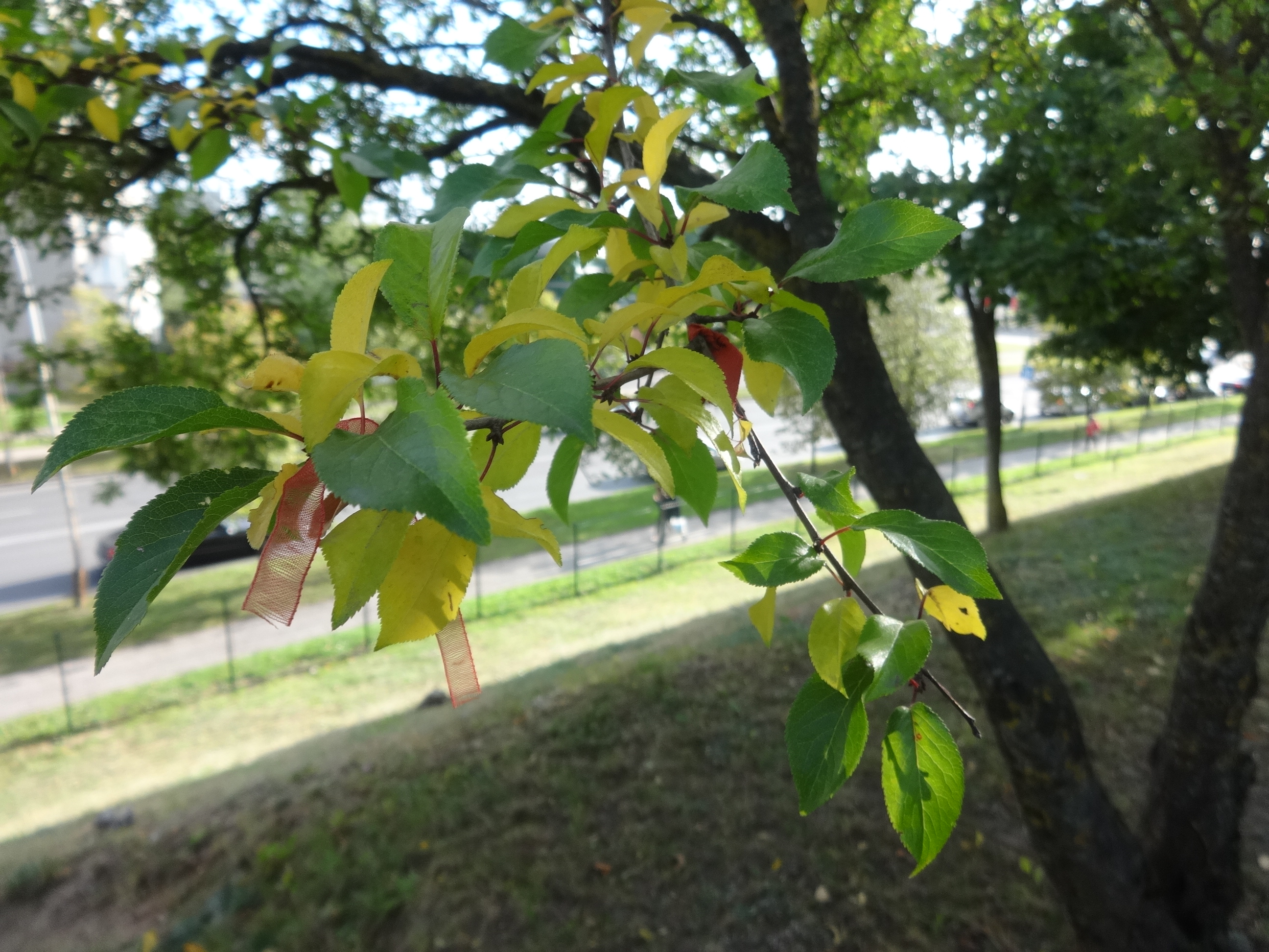 Greetings from Lithuania, Vilnius Fabijoniskiu school-gymnasium . We observe oak (Quercus rubra), as well as Birch (Betula Pendula) and Lime (Tilia Cordata),  the plum (Prunus cerasifera) maple (Acer negundo).Oak, birch, lime leaves on the trees 5GY 5/10, maple 5GY7/12, plum some leaves are still green 5GY 7/12, others are yellow 2,5Y 8/12.