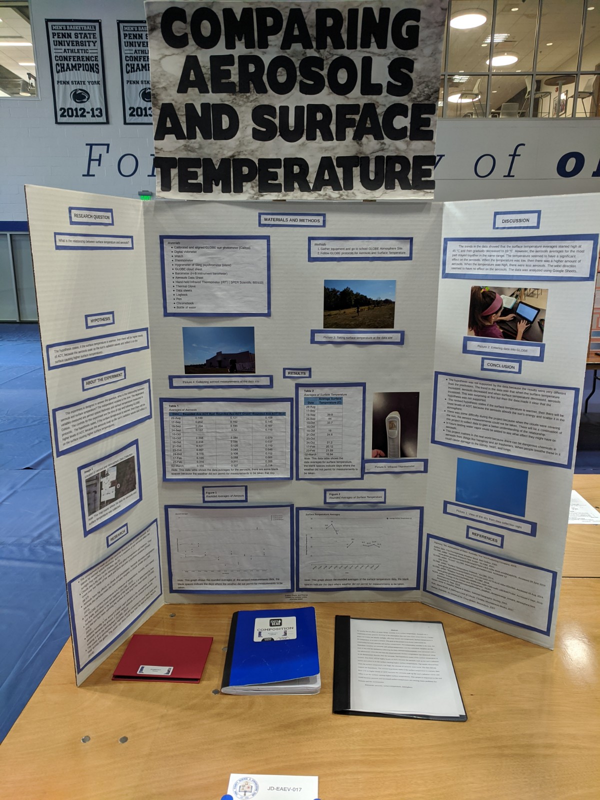 Abstract: Air quality has an effect on many things, possibly even surface temperature. Aerosols are a suspension of tiny particles floating in the atmosphere that can come from many sources. Certain types can scatter and absorb sunlight, affecting climate and temperature. Surface temperature is the temperature at or near a surface. The goal of this project is to better understand the relationship between aerosols and surface temperature. The independent variable is the time, the dependent variables are aerosols and surface temperature, and the controlled variables are the time of day and the method in collecting the data. Aerosol measurements were measured with a sun photometer when the sun was not cloud covered. Surface temperature was measured using an IR thermometer directly after the aerosols. The hypothesis states, if the surface temperature is warmer, then there will be higher levels of AOT, because the aerosols soak up the sun’s radiation waves and reflect it on the surface causing higher surface temperatures. The results showed that when the surface temperature was high, the amount of aerosols were lower. The data did not support the hypothesis. The revised hypothesis states if the surface temperature is warmer, then there will be higher levels of AOT, because the aerosols soak up the sun’s radiation waves and reflect it on the surface causing higher surface temperatures. This project is important to the real world because aerosols and increased surface temperature are causing many problems for humans and the environment.Keywords: aerosols, surface temperature, atmosphere