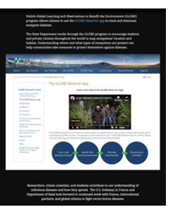 La comunidad GLOBE es parte de un esfuerzo internacional más amplio para educar y capacitar a los miembros de la comunidad sobre cómo prevenir las enfermedades transmitidas por mosquitos. En el Día Mundial del Mosquito, el 20 de agosto de 2019, la Embajada de los EE. UU. En Francia presentó un Story Map que muestra el poder de las asociaciones internacionales en los esfuerzos mundiales para combatir las enfermedades transmitidas por vectores. El Story Map destaca el Proyecto de Educación y Prevención de Zika de GLOBE, patrocinado por el Departamento de Estado de los EE. UU. Y la herramienta GO MHM, destacando el importante papel de observación y recopilación de datos de los científicos ciudadanos, "Aprendizaje y observaciones globales de la NASA para beneficiar el medio ambiente (GLOBE) El programa permite a los ciudadanos utilizar la aplicación GLOBE Observer para rastrear y eliminar los hábitats de mosquitos, lo que puede ayudar a las comunidades a tomar medidas para protegerse contra las enfermedades ".