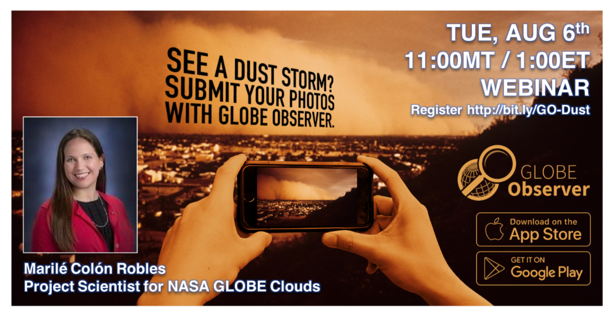 Si se perdió el seminario web del 06 de agosto "Cómo enviar fotografías de eventos de tormenta de polvo con GLOBE Observer", presentado por la científica del proyecto de nubes de GLOBE de la NASA Marilé Colón Robles, la grabación y los recursos educativos relacionados ya están disponibles.