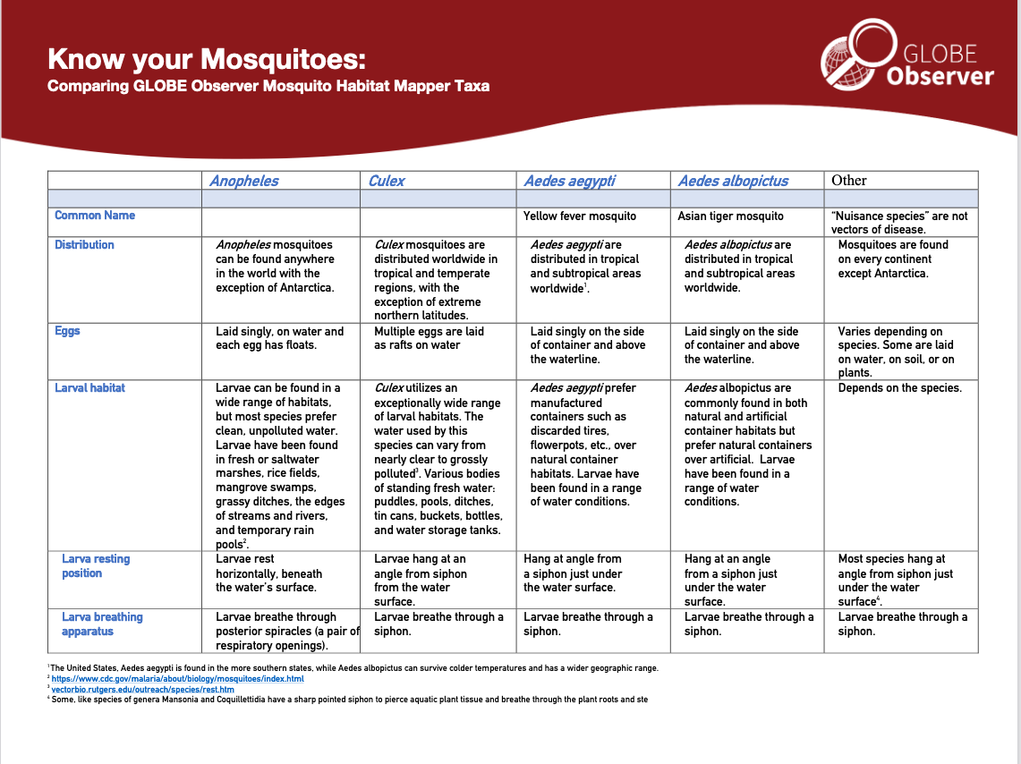 Completing the guide prepares you to participate in GLOBE Mission Mosquito. This international field campaign is connecting citizen scientists of all ages to monitor changes in the frequency, range, and distribution of potential disease vector mosquitoes by reporting observations using the GLOBE Observer Mosquito Habitat Mapper.