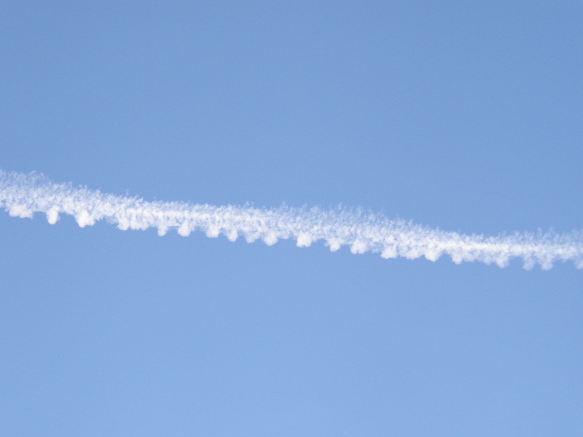 Persistent Spreading Contrail This is a narrower persistent spreading contrail, which is closer to the index finger width. Note the regular "loopy" appearance of the edge of the contrail, reflecting the swirling air motions that are set up behind the airplane. Photo by Carol Clark, Oregon. |