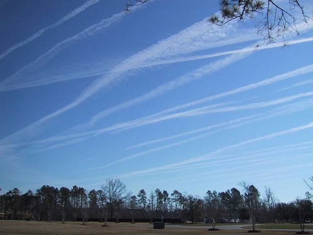 Multiple Persistent Spreading Contrails This is a fairly common sight on the East Coast, where lots and lots of airplanes fly between the major cities of the Eastern Seaboard. However this photo captures a wonderful display of these contrails, showing them at various stages of "spreading". Photo by Ralph McConnell in Hertford, NC, looking toward the northeast. Submitted by Aileen Seshun. |