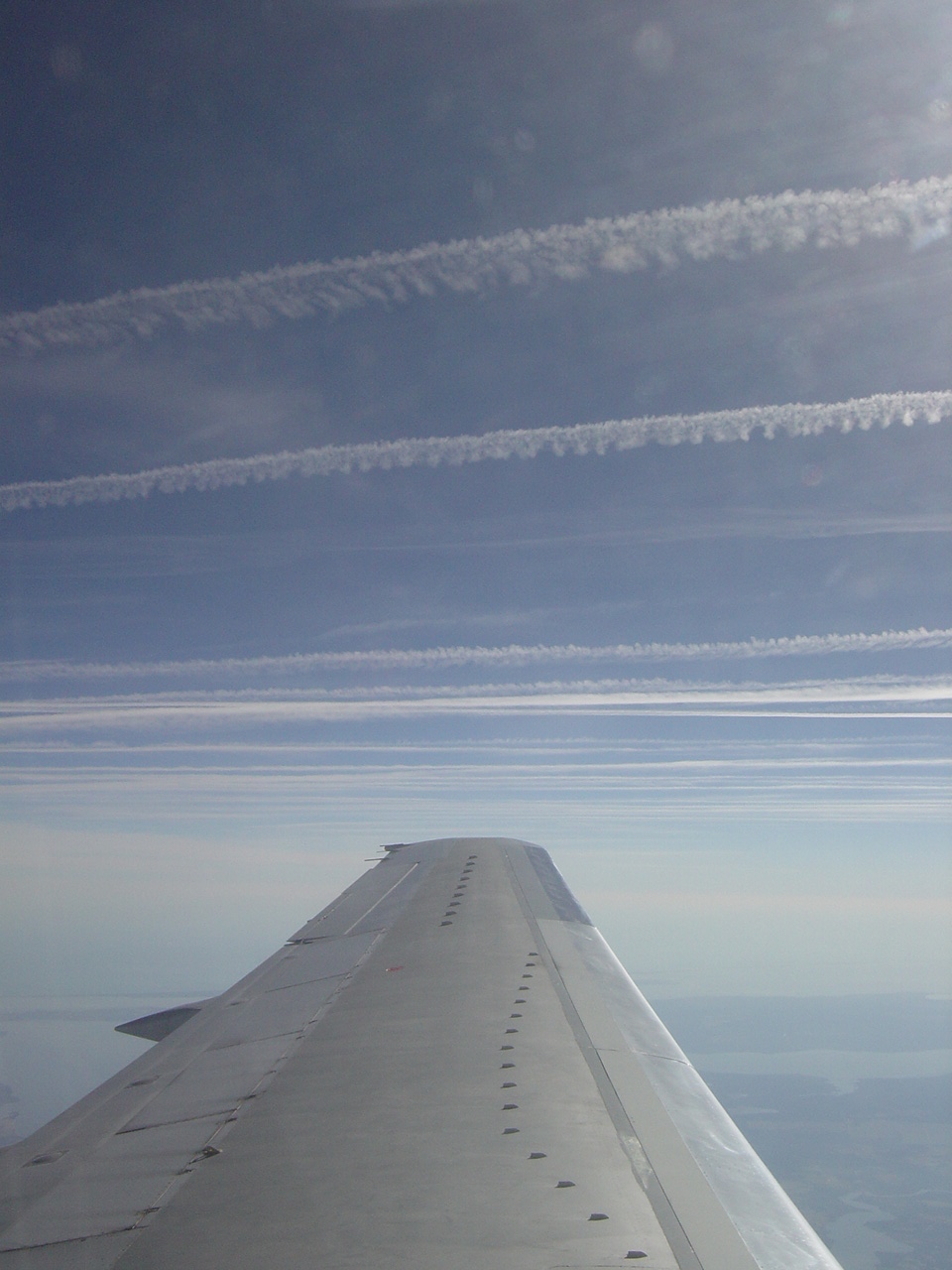 View from the Air On the same day and in the same area as above, here is a view from the air. This is taken on a southbound flight over North Carolina at 9:45 am on Feb. 20, 2004. From this perspective, one can see the large number of contrails from the morning's air traffic being carried slowly eastward over the Atlantic Ocean by the prevailing winds. Photo by Dr. Paul Filmer, |