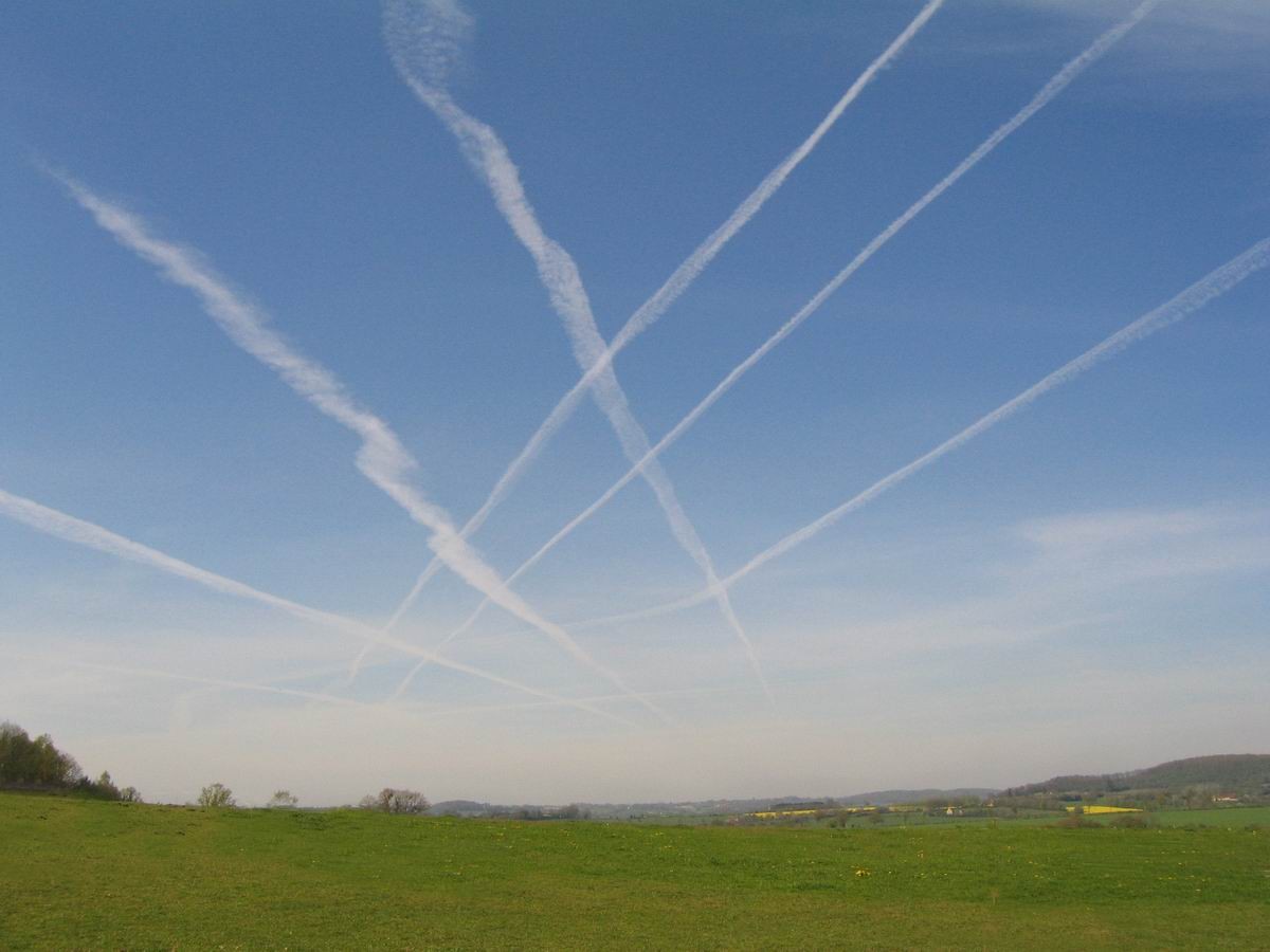 Criss-crossing contrails This photo shows a series of contrails creating a cross-hatch pattern across the sky. It was taken in near the town of Chartres, France. This is not too far from Paris. This interesting pattern is likely a result flights from the UK to Europe on the one hand; and within continental Europe on the other. Thanks to Didier for contributing this photo. |