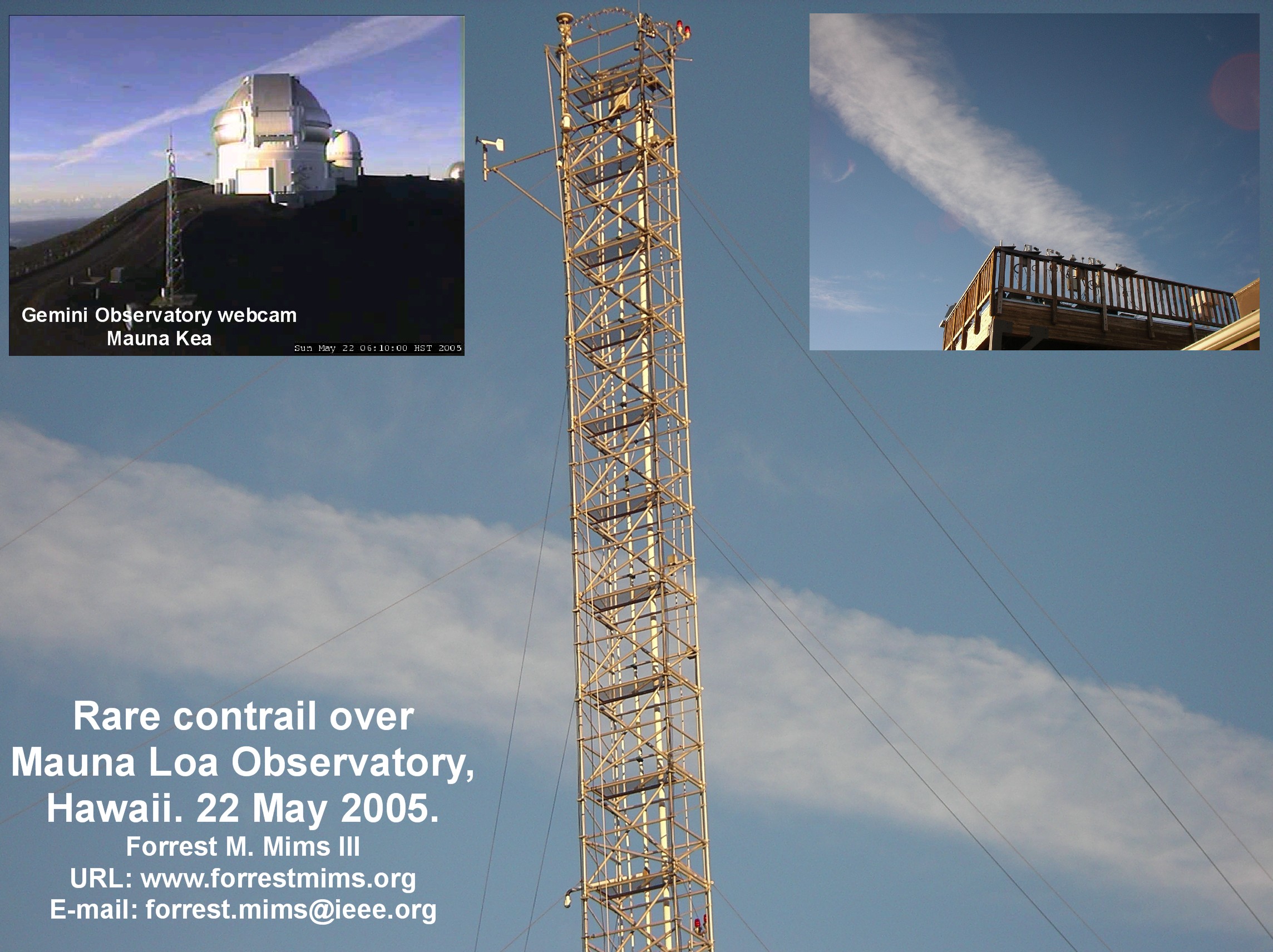 Contrail over Hawaii This photo collage shows a major persistent spreading contrail over the Mauna Loa observatory in the Hawaiian Islands. It was put together by Forrest Mims, who regularly visits the observatory for instrument work. Neither he nor resident scientists at the observatory could remember seeing such a contrail in this area before. Photos May 2005 |