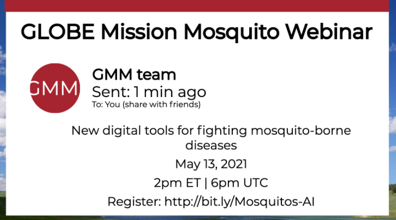On Thursday, 13 May, at 02:00 p.m. EDT (06:00 p.m. UTC), you are invited to join the GLOBE Mission Mosquito (GMM) webinar: “New Digital Tools for Fighting Mosquito-borne Diseases.”